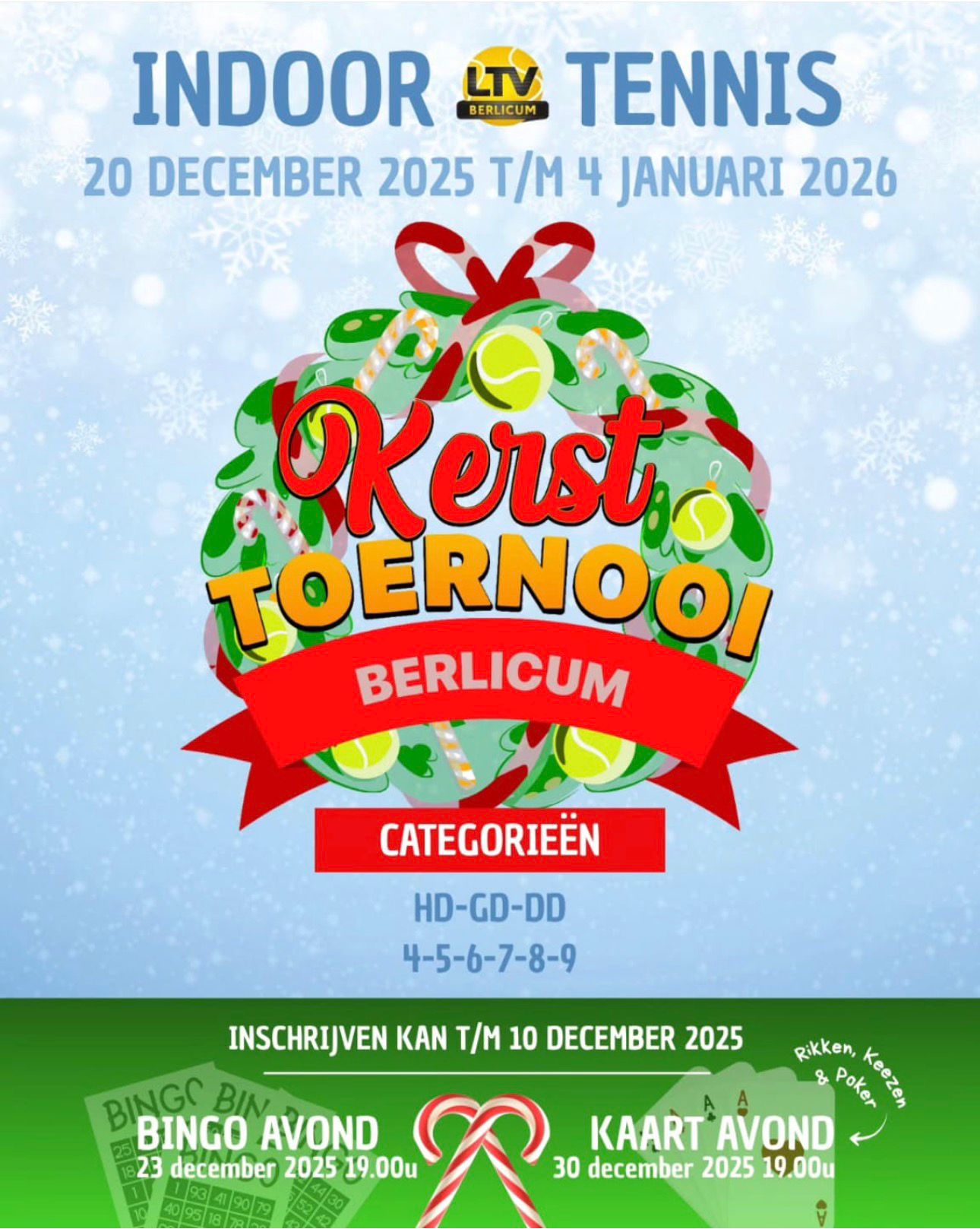 Inschrijven voor het indoor tennistoernooi kan tot en met 10 december op MijnKNLTB via https://mijnknltb.toernooi.nl/tournament/2EFB07D6-9CDF-4A86-A97C-112A120FF917
