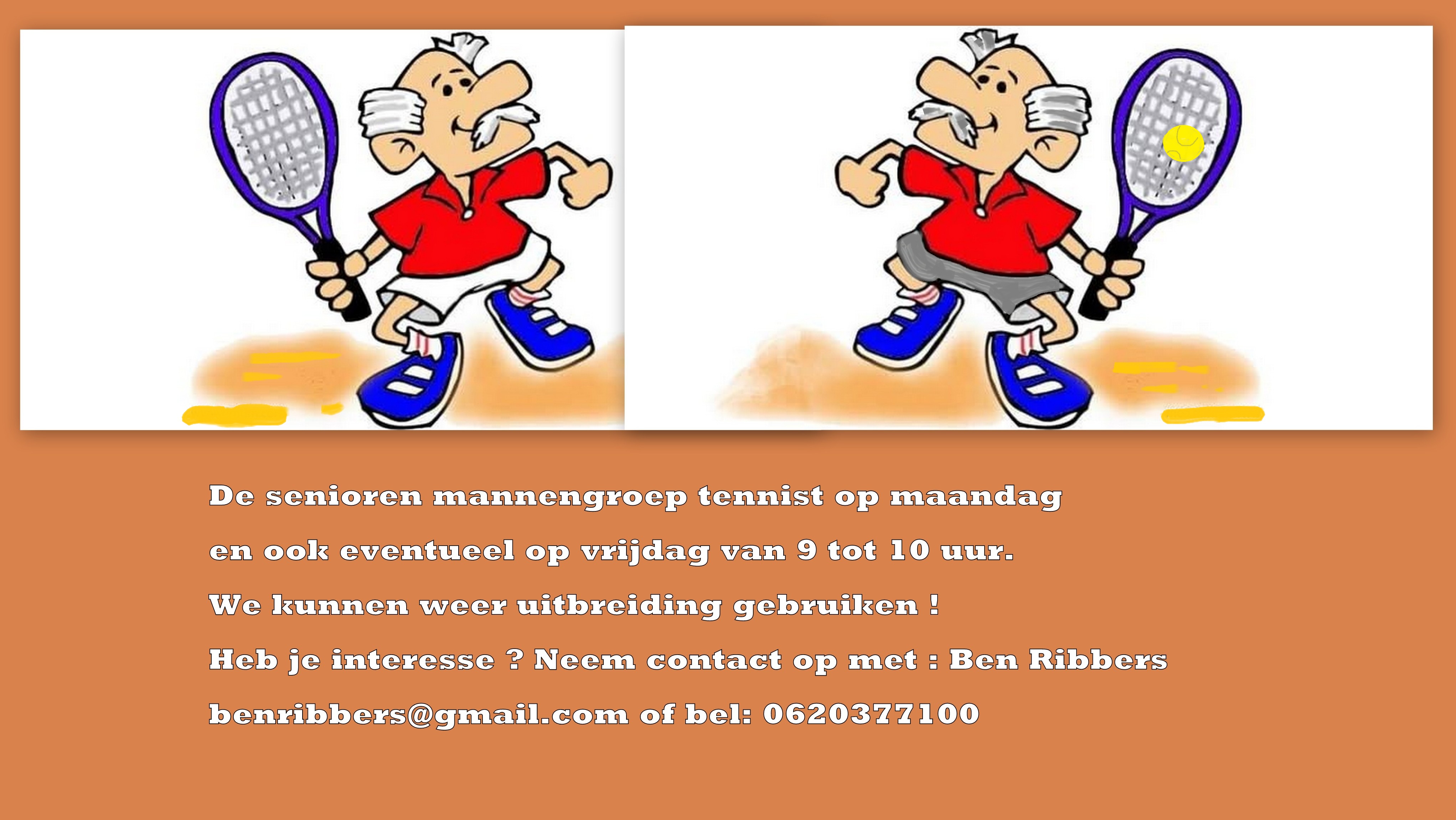 De senioren mannengroep tennist op maandag en eventueel op vrijdag van 9 tot 10 uur.